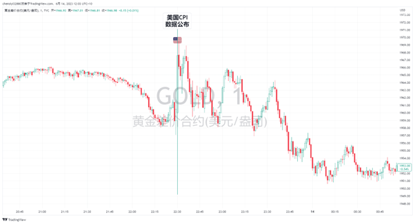 黄金美国CPI数据放缓的消息迅速引起市场的剧烈波动,黄金一开始下跌,但迅速从日内低点1949.20飙升至日内高点1971.02,也就是说金价在1分钟内波动了将近22美元,但又快速地回吐部分涨幅,1分钟内最终收于1967.61美元。