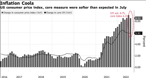近期的焦点是低于预期的美国 7 月 CPI,这引发了鸽派的市场反应。7 月 CPI 总体指标和核心指标均意外下滑,同比增幅从 6 月的 9.1% 降至 8.5%。尽管最近食品价格继续以较快的速度上涨,但燃料价格的下跌推动了CPI数据整体下降的走势。这次数据主要阐述了通胀从峰值跌落,能源,天然气价格回落、供应链改善。目前的政策越来越趋向于按照数据来制定。随着市场对 9 月加息的共识从 75 个基点转变为 50 个基点,数据引发了更多关于“通胀见顶”的争论。然而,回应数据的美联储官员认为,需要更多证据去决定是否放慢紧缩步伐。中国结束了围绕台湾的军事演习,但承诺继续定期巡逻,并发布白皮书撤回不派军的承诺。据报道,拜登政府官员正在重新考虑是否取消对中国进口商品的关税。在可预见的未来,地区紧张局势可能会持续升温、加速去全球化趋势的担忧,这些趋势也引发了对供应链持续的威胁和对结构性通胀上升的担忧。