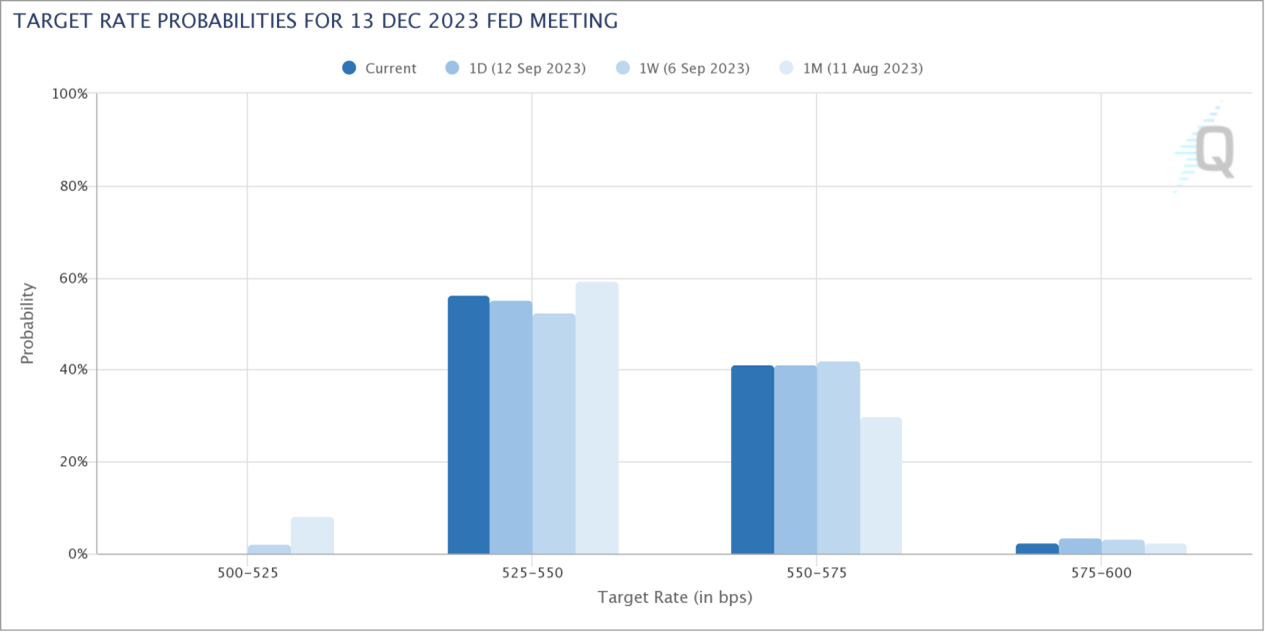 此前根据市场预期,整体CPI受到油价攀升、房价指数及工资增速较高将反弹,而核心CPI则应保持下降。因此整体数据来看,整体CPI超预期反弹且核心CPI月率不降反升。无论是美国物价指数还是核心通胀,都表现出一定程度的顽固,美联储后续或仍有理由加息。根据芝商所利率观察工具,因核心通胀如期下降,目前市场对于下周的九月联储会议不加息预期达成一致,达到97%。