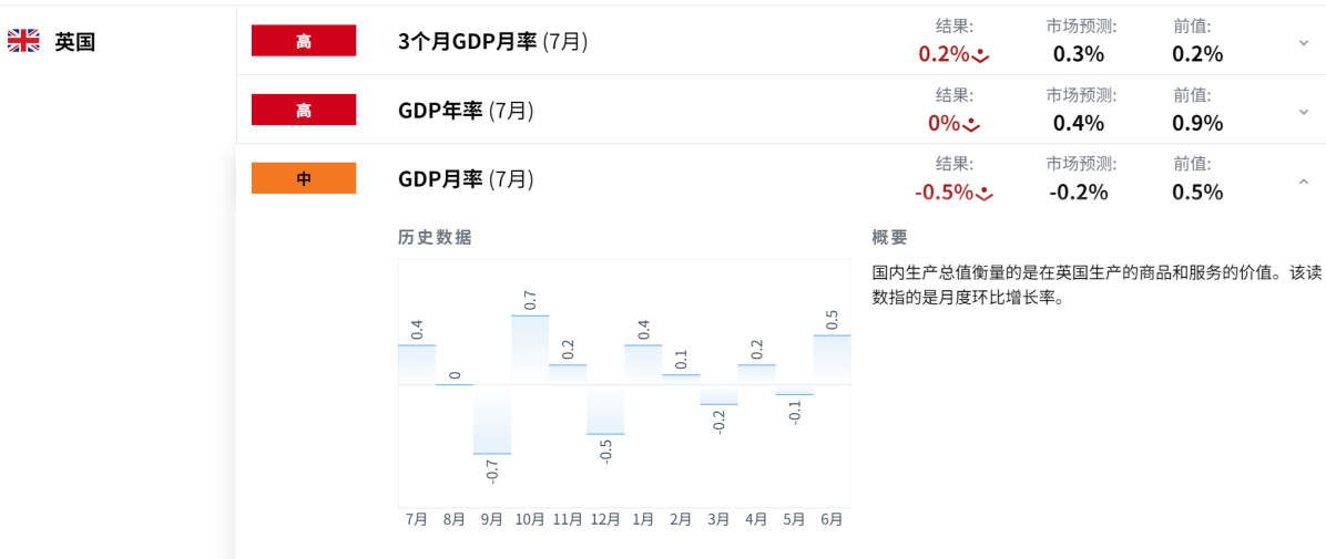 英国经济疲软 若美元继续走强英镑承压除昨日美国CPI数据外,昨日英国方面公布的7月GDP数据不及预期,GDP年率0%,低于市场预期的0.4%。月度GDP数据进一步显示加息下经济受到负面冲击,GDP月率-0.5%,为2022年12月以来的最低值。