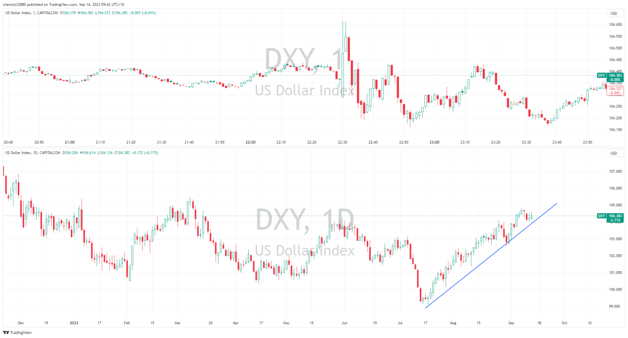 美元指数冲高后回落,年底大概率延续强势CPI数据公布后,1分钟美元迅速冲高回落。而美元日线图来看,近期美元指数上升趋势明显,支撑位看向104.40水平,站稳则看向105.00关口。整体看,短期内美元指数大概率在103.00到104.00之间区间震荡。反之如果其失守103.00,则表明美元疲软。