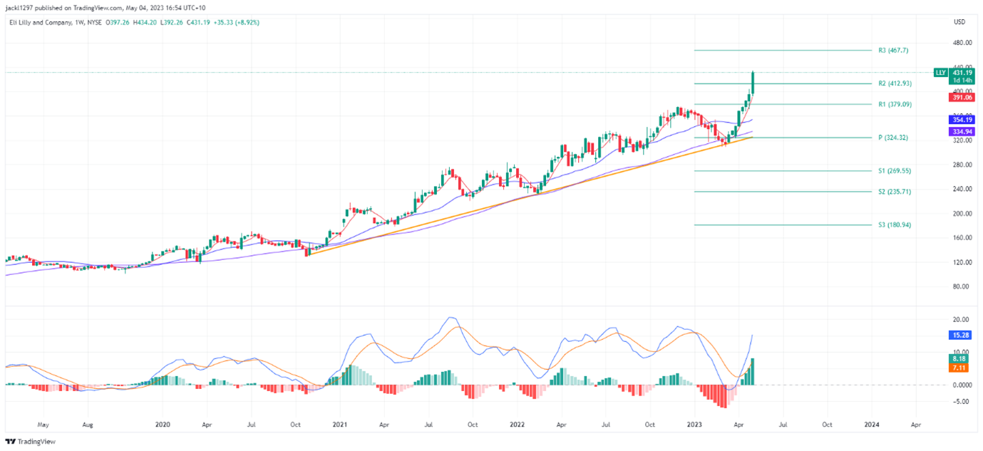 股价表现:技术面周看,股价自2020年10月开始快速攀升,迄今涨幅达到230%,来到431.19美元的历史新高。2023年至今看,其涨幅17.73%也跑赢JNJ和MRK等药企巨头。K线方面,其始终运行在季度均线与趋势线上方,多方完全掌握中长期走势。MACD指标长年位于0轴以上,目前处于强势上升阶段。下一目标位可以参考467.7美元位置(PIVOT),支撑位可以参考412、379(前高位)、324(均线与趋势线支撑点)。