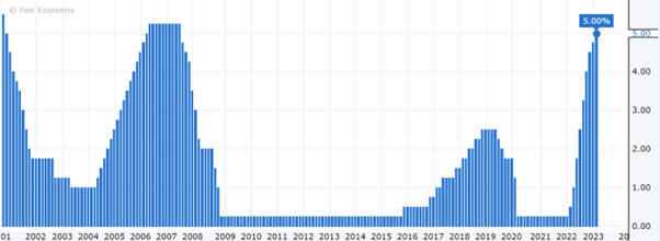 (有兴趣的的朋友可以看我们之前的文章以了解硅谷银行破产详解)根据官方的中值估计,美联储预计利率将再增加25 个基点,达到5% 至 5.25% 的峰值区间,这与12 月份的估计一致,但低于SVB 崩溃前的市场预期水平。鲍威尔还说道,美联储的官员们在今年看不到降息的可能性,并且有必要的话,美联储将会进行继续加息。