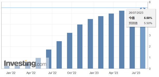 其后,美东时间7月26日周三(澳大利亚东部时间7月27日凌晨4:00),美联储货币政策委员会FOMC会后宣布,将联邦基金利率的目标区间上调至5.25%到5.50%,升至二十二年来高位,加息幅度25个基点,幅度符合市场普遍预期。尽管联储方面表示不排除未来加息的可能,但是市场普遍预期7月为最后一次加息。