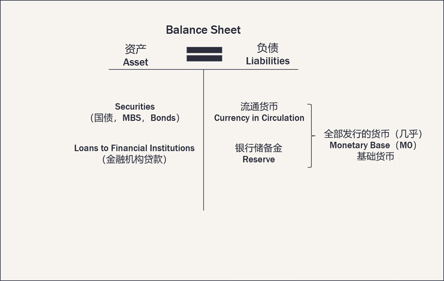 我们都知道央行就是发行货币的,所以它的账本最应该记录就是发行了多少货币。在咱们普通人手上,钱就是我们的资产。但是在央行,它发行的货币其实是它的负债。我们来看一看它的负债的组成部分,央行发行的所有的货币主要存在于两个地方。第一就是流通在市面上的货币叫做currency in circulation。另外一部分叫做reserve,就是各大银行存在央行里的货币。我们可以把央行理解成银行的银行,每个银行都被规定必须要在中央银行存上一定的储备金。相信这个说法大家都听说过,这个储备金呢可以理解成不在市场上流通的货币。这些流通的跟不流通的钱加起来几乎就是央行发行的全部货币。央行管他们叫做monetary base,这也就是我们平时说的M0,也叫做基础货币。央行的负债这一点咱们搞明白了,它的资产就相对容易理解了。央行的资产主要可以分成两大类。第一,各类证券securities,比如说美国国债以及央行购买的其他债券,比如说什么MBS ,房贷资产化债券,以及疫情期间,央行购买了很多企业的债券。第二类大资产就是金融机构贷款。比如说各大银行从央行借的这个贷款之类的。这就是美联储的资产负债表。美联储对宏观经济的几乎全部的政策都可以反映在对这张表格上。这张表左右两侧必须相等,这就意味着当美联储想要去改变这个表格中任意测的数字时候,表格的另一侧就必须发生变化。所以美联储所谓的印钱,它并不是所谓的单纯的印钱,它一定有对应的其他操作。想要理解美联储究竟如何缩表,我们首先需要理解它是如何扩表的。所谓扩表就是让这个表格的这个两边数字同时增加,以达到货币供给的目的。具体的做法就是央行去公开市场上购买表格左侧的这些国债以及其他债券。比如央行从市场上购买了一亿美金的美国国债,么这张表的右侧的基础货币部分就需要增加一亿美元。这就是增加货币的供应,就是咱们常说的美联储印钱,实际上美联储不需要真的去印钱。他直接在这张表上改一下数字就行了。在经济危机的时候,比如说2008年以及2020年,美联储都会去市场上大量地购买债券,以实现向市场注入货币,刺激经济的目的。这个过程呢就是所谓的QE( quantitative easing)量化宽松政策。这个QE 或者说货币供应最直接的结果就是导致利率下降和通货膨胀。利率下降可以通过两方面来解释。第一个就是当美联储在市场购买债券的时候,就会导致债券的需求增加,价格上升,而债券的价格和收益率呈负相关,债券价格上升,收益率下降,进而传导到整个经济,导致利率下降。其实单纯的通过货币供给关系,也能理解为什么增加货币供应会导致利率降低。利率其实就是借钱的成本了。当市场上货币少的时候,借钱就难,所以利率就高。当市场货币供应增加的时候,借钱就会更加易,所以利率就会降低。这个扩表或者说QE的第二个结果呢就是通货膨胀,钱印多了,钱就不值钱了。这个我们就不展开讲了。美联储通过QE 扩表,最终的目的是希望通过向市场增加货币供应,降低利率,让借钱变得更便宜,增加流动性。以达到刺激经济的目的。