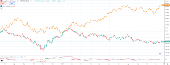 橙色的K线是美国纳斯达克,从2022年7月份以来,已经上涨了42%,但是HK50香港很伤感,下跌了17%,所以落后了60%。真是同样是股民,投恒生的,去年100万,今年是80万,投纳斯达克的,去年是100万,今年是142万。差出来一套房了。所以,HK50目前价格很低,如果政策底连续筑底,且美元回流美国速度减弱,加息结束,未来新兴市场的资金会更加充足,有更大的上涨潜力。