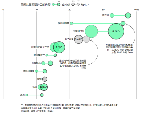 我们可以看到,2022年之后,墨西哥与美国的贸易额再次抬头,在近期超过中美贸易额。到 2023 年,外国直接投资在墨西哥已经增长了 40% 以上。自 1994 年北美自由贸易协定生效以来,墨西哥经济平均每年增长约 2%,远低于发展中经济体的平均水平,远不足以让数百万墨西哥人摆脱贫困。但是,这次的中美矛盾,让墨西哥抓住了机遇,拼不过中国制造,但是可以拼过印度制造。不过,墨西哥要完全替代中国在美国的贸易地位,显然也不可能,只能在部分行业,比如不需要科技含量的基础制造业中,取得更大优势。因为墨西哥目前的电力传输,水资源等并不能够完全支撑墨西哥企业的快速发展。墨西哥目前随处可以看到,开工的挖掘机,工业空间从2019年开始,每年以两位数增加,进入了快速发展期。全国都在建设基建和工业园区,跟当年的中国类似。通用汽车、起亚汽车和宝马等其他汽车制造商已宣布自 2021 年初起在墨西哥投资电动汽车,同时过来的还有航天工业等高科技产业。因为大家去墨西哥建厂比去中国建厂,对这些企业来说,更放心,这里的放心是指不会被政府贴上泄密等标签。