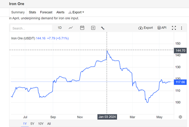 从上面铁矿石走势图,我们基本可以看出其和澳元的走势非常相似,都是在2024年初达到高点,之后一路下滑。铁矿石在短短4个月内从 145下跌到了100,整整跌了30%。虽然现在有所反弹,但是总体来看依然比较低迷。为啥呢?大家想想就应该知道,全世界用铁矿石最多的国家就是中国。而铁矿石炼出来的钢用的最多的就是房地产,汽车和基础设施建设。而根据中国冶金官方数据,从2023年开始,中国的钢材产量,需求量,以及铁矿石进口量和需求量分别对比2022年下降1%到2.7%之间