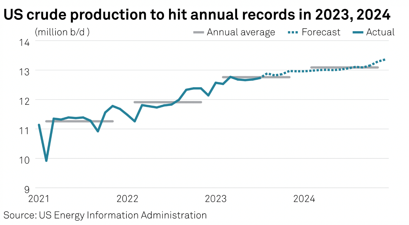 那么除了WTI 油和布兰特油这两种具代表性的指标油之外,在石油产业相关的股票中有没有值得我们关注的呢?我们知道最近一直很热的话题是欧佩克+一直强烈呼吁其成员国遵守石油减产协定并不断延长其减产协定时长,这一协定旨在稳定油价,进而稳定国家财政收入。欧佩克+的减产计划实际上给了美国的石油产业很大的机会。我们知道美国,俄罗斯,和沙特是全球前三大石油生产国,其石油合计产量通常占全球的40%左右。而俄罗斯和沙特都是欧佩克+的主要成员国之一,并且一直是石油减产计划的积极参与者。那么这也就意味着美国在石油生产上就更具竞争优势了。更何况美国已经于2023年重回最大产油国的宝座,其产量已达到1290万桶/日。