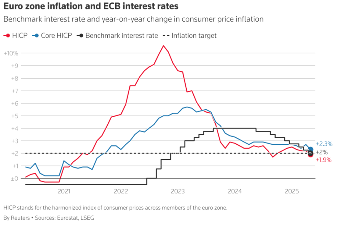 1. 政策预期差是欧元反弹的核心引擎降息周期尾声的明确信号成为关键转折点。欧洲央行行长拉加德在6月会议后的声明中埋下伏笔:"在当前的利率路径下,我们处于有利位置。"路透社曝光的内部讨论进一步佐证——决策层已达成共识,暂停降息至少维持至9月。这一转向的底气来自最新通胀数据:(1) 6月核心HICP环比降至0.2%(前值0.6%)(2) 2025年通胀预测下调至2.0%(去年12月预测2.3%)(3) 但服务通胀仍顽固保持在3.9%