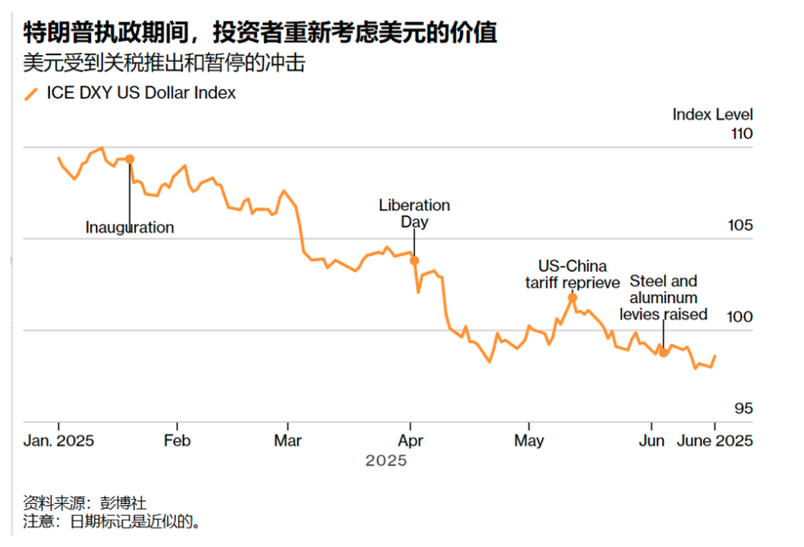 (图:欧元区通胀与利率走势图显示,2025年6月降息后利率曲线趋平)与此同时,美联储的降息时钟正在滴答作响。CME FedWatch Tool显示,9月降息概率达58.4%。当欧洲央行率先完成宽松周期而美联储刚刚启动时,政策节奏差取代绝对利差成为新主导因素。2. 美元的双重困局:当债务撞上政治放任美元指数的持续疲软揭露出更深层变革。美元指数在2025年6月跌破100关口,较年初下跌4.7%,背后是三股力量的合谋:(1) 债务雪球加速滚动美国财政部2025年第一季度债务展期规模达1.2万亿美元,偿债成本占GDP比例突破3.5%历史阈值。当10年期美债收益率维持在4.3%高位,每加息1%意味着年度利息支出增加3000亿美元。(2) 政治放任助推贬值