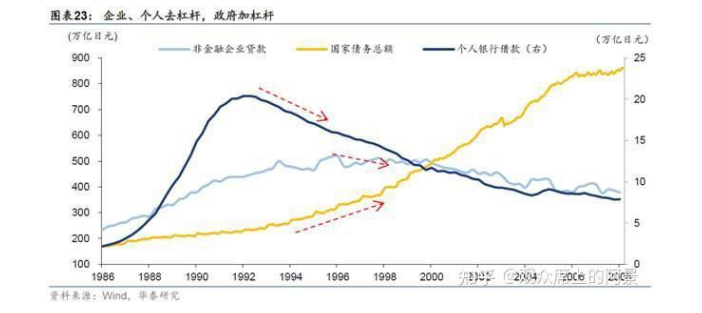 热门话题自从 90 年代初日本房地产泡沫破裂之后,该国的财政货币政策就一直坚持着宽松路线,并且始终未曾回头。最初,日本希望通过宽松的货币政策来振兴经济,但很快发现货币宽松并未能有效刺激经济。由于企业和个人都在考虑偿还债务,不再愿意继续借债,导致"借款人消失",使得货币宽松的调控政策失去了效果。为应对这一情况,日本政府被迫转向财政政策,开始依赖政府主导的方式,并采取了政府加杠杆的模式,充当了"最后借款人"的角色,替代了企业和居民的杠杆过程。到 1994 年,日本政府债务占 GDP 的比例超过 80%,三年后,即 1997 年,这个比例已超过100%。而到了 1998 年,亚洲金融危机袭来,日本政府再次不得不举债来救助银行和企业,使得债务占 GDP 的比例迅速达到了 113%。