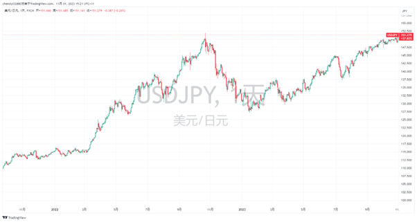 日央行提高了收益率曲线控制政策(YCC)的灵活性,即允许10年期日债收益率升至1%以上。但这一措施不及市场此前预期,使得日元迅速走低。美元/日元上涨势头明显,消息当日上涨1.75%至151.66,一度接近去年10月的最高点151.94。