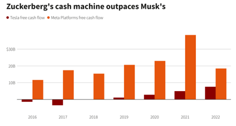 首先特斯拉的优势在于体量。这家电动汽车制造商的市值约为8,000亿美元,比扎克伯格的社交网络平台高出近1,000亿美元。虽然Meta的收入更大,但特斯拉的增长速度更快。接受Refinitiv调查的分析师预计,到2025年,两家公司的营收将几乎趋同。而在投资回报方面,特斯拉也占据上风。2012年,Meta(前身为facebook)首次上市时,每投资1美元,现在价值为7.45美元。同样的1美元投资于特斯拉,现在价值144美元。然而就财务状况而言,Meta更有实力。据最新统计,Meta拥有370亿美元现金和有价证券。特斯拉的现金储备也在不断增加,但扎克伯格遥遥领先,他在过去五年里累计创造了1160亿美元的自由现金流,其中960亿美元通过回购返还给了股东。