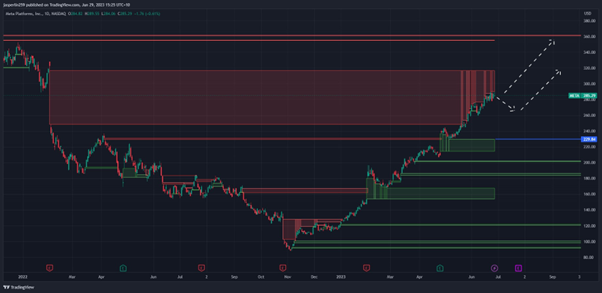 Meta方面,目前仍处于强势的上涨阶段,第一和第二目标位将是316和360左右。下方支撑参考265和230左右。