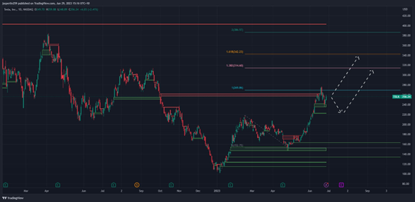 文章最后,话虽如此,我们还是得澄清以上仅仅是一些有趣的对比。要知道今年Meta和特斯拉都是美股里表现最强悍的代表,两者今年至今分别上涨了132%和116%。这一切都归功于人工智能的爆发,他们都是受益者,Meta的大语言模型(LLM)和特斯拉的自动驾驶都让市场充满了期待。股价表现上,它们距离前高分别有35%和62%,都具备后市较大潜力。技术分析:日线图上看,特斯拉处于自年初低点开始的第二阶段上涨中,第一和第二目标位将是314和342左右。下方支撑参考235和222左右。