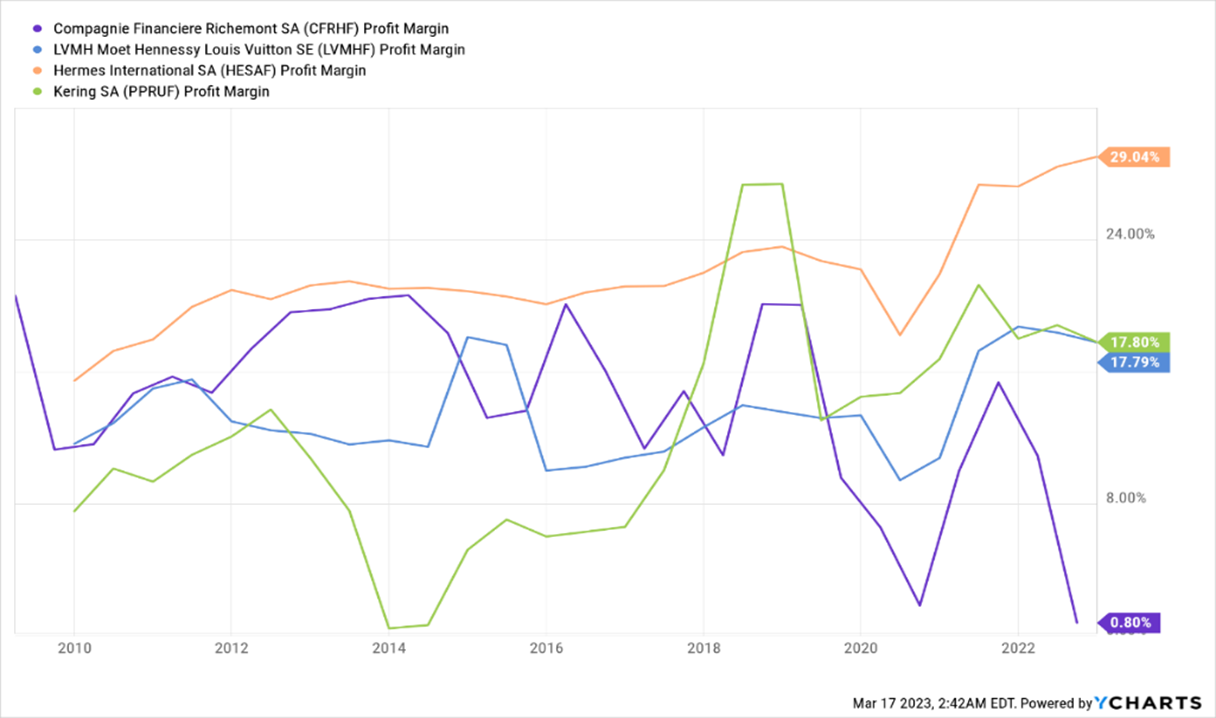 上图可见,开云营收的变化幅度较大,而爱马仕整体处于稳定增长的趋势,与全球经济周期的关联不大,营收增长的驱动力来自公司本身,反映出公司在行业中强大的营收增长能力。奢侈品具有很强的社会属性,本质是财富与地位的象征,竞争集中在几乎没有价格敏感性的头部高净值客群,公司销售强劲,具有很强的定价权(2023年计划上调产品价格5%-10%)。从净利润率角度看,从2010年以来,爱马仕在四家巨头里面长期扮演领头羊的角色,增长平稳一直维持在17%以上。特别是疫情爆发的2020年净利润率也未低于18%,之后更是加速增长,去年达到29%之高。比较之下,LVMH净利润率则波动稍大,目前处于17.79%水平,与爱马仕有一定距离。开云集团方面,在2018-2019期间达到过高位,但整体来看,净利润率控制不佳,有大起大落的过程,现在位置与LVMH持平。历峰的净利润率大概处于下降趋势,是四家里面表现最差的,当前仅为0.8%。
