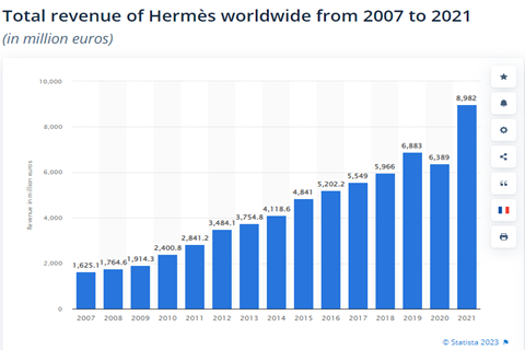 过去十年全球个人奢侈品市场整体保持着较为平稳的增长态势,可以看到爱马仕的营收从2007-2021年也是一直保持线性增长,唯有在疫情爆发年份有所下滑。根据预测,之后五年市场份额将继续保持线性增长,至2028年预估达到4189亿美元。
