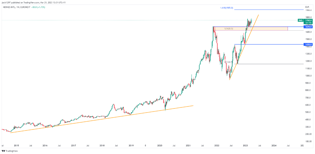 爱马仕股票是股市表现最好的股票之一,过去三年时间,爱马仕股价从520欧元左右涨到1760欧元,涨幅超过238%。当前市值1960亿美元,PE较高为55倍。在盈利能力方面,现在每股收益33.98美元,购买爱马仕股票给这些股东带来越来越多的利润。尽管这种趋势很诱人,但也必须保持警惕,毕竟之前涨幅太过惊人。笔者认为,良好的前景可能让2023年爱马仕股票价格继续上涨,基本维持看涨格局。技术面看,截至2023年3月21日,股票价位1760欧元,下方有1620-1670区间的短期支撑,如果企稳在该区间上方,则股价仍为稳健上行阶段。假如价格下破该区间,可以再等待1430位置的低位看多。上方下一目标位将是1900欧元,然后是2080。
