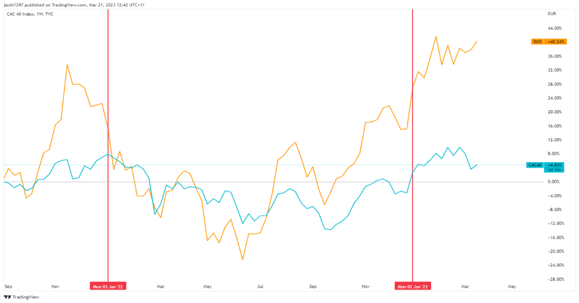 法国CAC40是目前全球第五大,也是欧洲最大的股票市场。受奢侈品生产商LVMH集团、开云集团和爱马仕国际的强劲势头推动,法国股市成为了2023年迄今在全球范围内表现最好的主要市场之一。截至2023年3月21日,CAC40指数上涨7.6%超过标普500的3.3%。而爱马仕长期跑赢大盘,在2022年熊市里其股价下跌6.5%,同期CAC40指数下跌10.5%。2023年至今,爱马仕股价已经达20.5%涨幅。