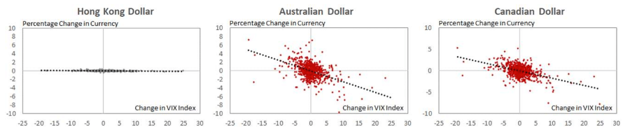 我们可以通过对比恐慌指数变化时,不同避险货币的变化情况,来衡量其避险能力。首先是美元日元以及瑞郎,我们可以明显的看到,当风险指数上升时,美元以及日元的上涨体现出了其避险能力,其中,日元的涨幅要高于美元,所以看似日元的避险能力或者说对于风险事件的敏感度要高于美元。瑞士法郎对于恐慌指数几乎是没有相关性的,也就是说不论风险如何,市场对于瑞郎的价值认同都是不变的,因此这种极其稳定的属性也让瑞郎成为了避险货币之一。