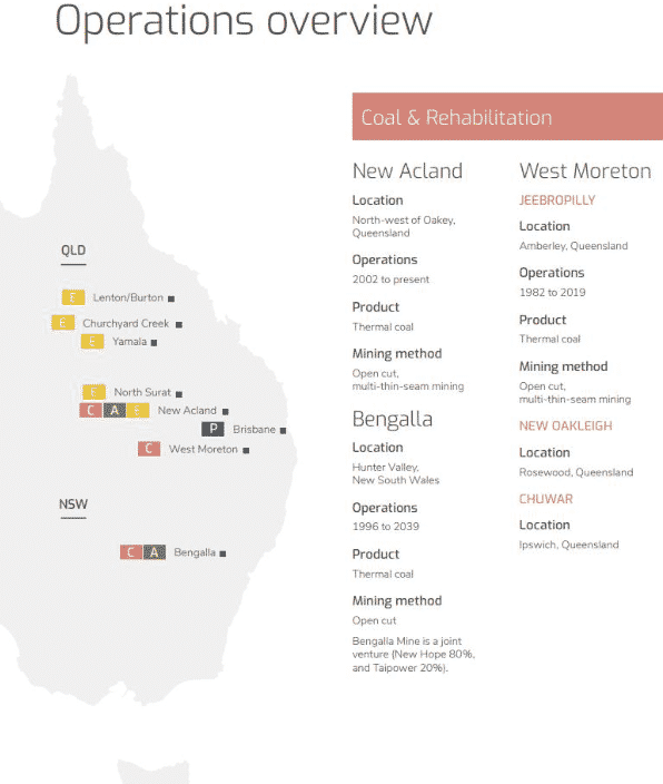 新希望有限公司New Hope Corporate(ASX: NHC)New Hope Corporate (ASX: NHC) 是一家开发,处理和生产石油,天然气和煤炭的 澳洲上市公司。公司总部位于澳大利亚布里斯班,自 1986 年成立以来,目前在日本 中国,智利,韩国,印度和越南都有运营。公司目前主要有 4 个板块的业务:煤炭, 开采开发,港口和农业。目前煤炭业务主要集中在新南威尔士,昆士兰州都拥有动力 煤(Thermal Coal)开采场。如下图所示,蓝色P字样为公司拥有的港口,位于布里斯班。灰色 A 字样为公司正在运营的农业业务。黄色E字样为目前正在勘探的矿场, 后红色 C 字样为正在开采的矿场。