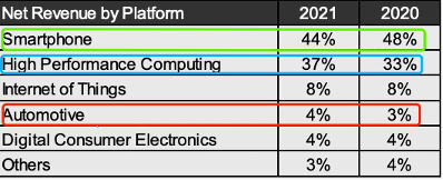 业务板块收入方面,来自智能手机的收入相较去年的48%下降至44%;2021年的高性能计算(HPC)的营收比一年前提高了4%,相信随着未来人们对算力需求的高速增长(虚拟货币,原宇宙等),HPC业务将来是台积电未来长期营收增长的强劲动力。除了HPC的营收比例增加了以外,2021年汽车芯片的收入占比也从2020的3%提升到了4%。因为去年汽车芯片几度短缺,所以汽车芯片的产能也因此提高了,收入相应有所提高。