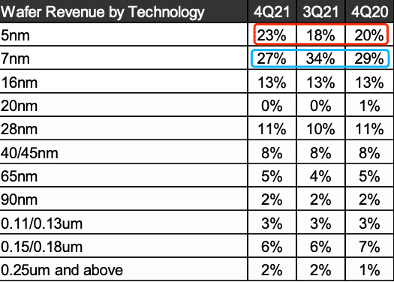 作为制造业的一员第四季度的毛利率也给出了十分不错的数据,高达52.7%。毛利率虽然同比下降了1.3%,但环比增长了1.4%。意味着芯片涨价给台积电带来的利润开始慢慢的弥补高阶芯片的制造成本增加。芯片收入方面,对比第三和第四季度,5纳米芯片的收入占比再一次的提高。五纳米芯片的营收占比,从去年第三季度的18%,第四季度提升到了23%(图三),并且,7纳米新品的营收占比重减少,这说明整体产能在向高端芯片倾斜。预计这个趋势在未来还会继续。因为采用五纳米芯片的电子产品越来越多了,也包括我们平时的汽车中,现在高端车型的后视镜,大灯总成等都有安装芯片来给我们带来更好的使用体验。