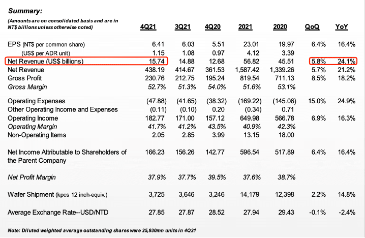 曾经用三星做芯片代工的苹果,在2015年将整条生产线移至台积电,并且目前越来越依赖台积电的代工。可以看到,台积电就是占据了芯片制造行业所特有的天然的垄断优势,不断挖掘行业内的新机会。一旦签订合同,又能够持续增加用户粘性,这些都是台积电这家公司作为投资标的的一个基本保障。那么未来台积电是否能够保持这样的高速增长呢?未来科技的发展方向已经非常明显了,人们无论是日常还是国防都离不开芯片的发展,从5G的普及以及特斯拉自动驾驶,越来越智能的手机以及汽车零部件中都离不开高端芯片的发展。未来高端制程芯片的需求几乎必然呈指数性增长。台积电在业内的优势就显而易见了。另外,由于台积电和苹果的紧密依存关系,苹果的持续扩张也会给台积电带来海量的订单,台积电也被认为是最大的苹果概念股。台积电未来发展上的风险主要来自于三星的竞争。假设说三星制造出来的芯片性能持续落后,那么它输掉的就不仅仅是与台积电关于芯片制造的竞争,还可能拉远其与苹果手机的距离,这是三星承受不起的。因此三星会从别的部门抽血供养芯片研发,为的就是保持竞争力。而这点是台积电做不到的。台积电目前最大的限制,就是产能问题。台积电目前基本每年都在全负荷的运转,提升产能的空间非常有限。目前要在美国亚利桑那新建设的5NM工厂,施工进展缓慢,计划于2024年开始量产。整体来说,台积电基本面还是利好的,虽然有着竞争压力,但是也是促使台积电不断前进的动力。台积电这两天之所以涨得这么好,是因为他们的财报非常出色。来看一下他们对自己和整个半导体行业的2022的最新展望。我们先从营收开始讲起。台积电在2021第四季度的营收高达157.4亿美元,环比增长了5.8%,同比增长了24.1% (图一)。去年第四季度的营收不仅超过了之前的预期,且又再一次的刷新了历史记录。如此漂亮的第四季度的业绩也让2021年的全年营收增长高达24.9%。