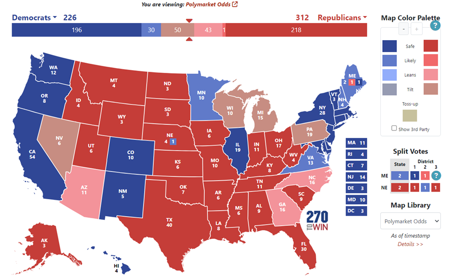 离美国大选只剩2周,10月以来,以特朗普为首的共和党一统参议院、众议院的博彩赔率快速提高,由29%升至43%,而特朗普本人获胜的概率升至57.9%领先哈里斯——当然,博彩平台投注中反映的赔率并不一定完全反映当前选举的胜率。所以更重要的来了,近日特朗普在关键摇摆州支持率上反超了哈里斯,这意味着什么?由于美国选举的设定,两党需要 270 张选举人票以赢得选举,当前摇摆州虽然只有 8 个,选票却有 104 张。在红州、蓝州固化的情况下,这一方面意味着两党都无法单单依靠固有阵营赢得总统选举,另一方面也意味着只要一方能够赢下摇摆州,就几乎肯定能够入主白宫,所以市场开始认为由特朗普获胜大选很有可能是最终的呈现结果。