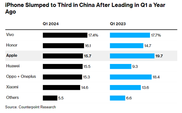 中国手机市场整体增长约1.5%,荣耀、小米等本土品牌引领增长。2024年第一季度iPhone占中国所有智能手机销量的15.7%,同比下降19.7%。华为的智能手机销量猛增 69.7%。华为 Mate 60 智能手机备了支持下一代 5G 移动连接的高端芯片。美国一路封锁,却也终于让华为杀出来一片天地。苹果中国市场占有率从第一名跌至第三名,落后于中国品牌Vivo和华为前子公司荣耀。2024年第一季度iPhone出货量同比下降9.6%。出货量下降意味着苹果将全球最大手机制造商的地位让给了竞争对手三星,三星第一季度手机出货量为6010万部,而苹果的手机出货量为5010万部。全球第一季度智能手机整体出货量增长了7.8%。中国小米手机在国内排名第六,但第一季度全球手机出货量为 4080 万部,位居第三,仅次于三星和苹果,并实现了 33.8% 的大幅增长。