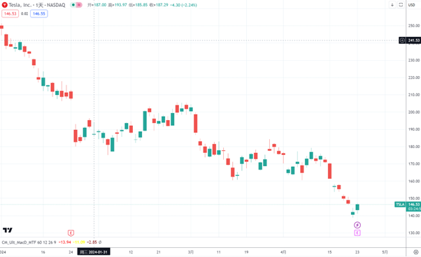 苹果最新数据显示中国 iPhone 销量暴跌19%,创2020年以来最差季度,苹果股价也没有跟上英伟达等AI龙头,反而进入2024年一路下跌,消费市场与资本市场集体看空苹果。与苹果相伴的是特斯拉,股价也是凄凄惨惨戚戚,全球裁员,持续降价,股价接近腰斩,从年初250美金附近,短短4个月不到,跌至150美金下方。
