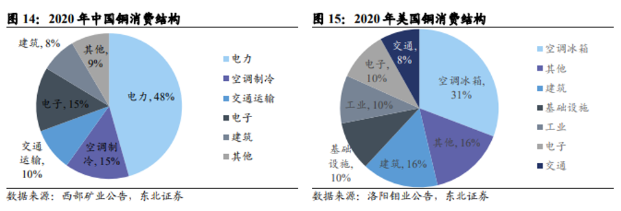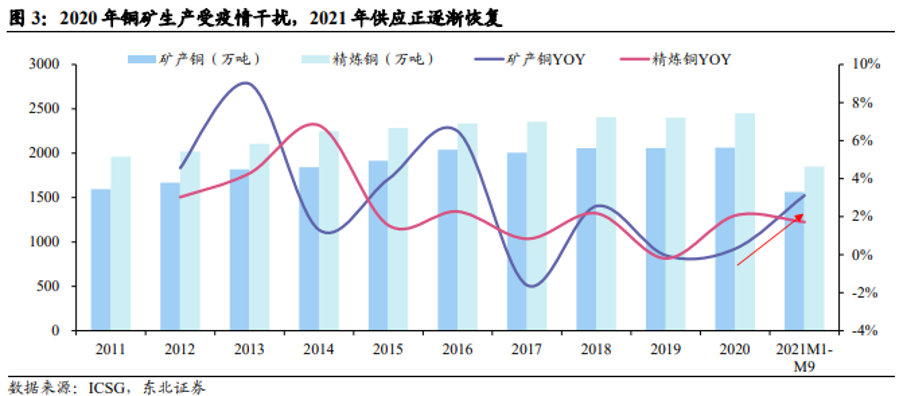 受疫情冲击,2020年铜矿供应弹性相对不足,据 ICSG数据,2020年全球矿产铜产量为 2063.4万吨,同比仅增加 0.3%。但随着疫情缓解后企业复工复产。全球 17 家主流铜矿企业 2022-2023年产量同比增速分别为 7.6%、5.2%。关注投资机会:BHP股票+铜期货