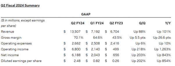 在周四,英伟达公布了第二季度的财报。Nvidia 在第二季度报告了 135.1 亿美元的营收,这一数字远超过了华尔街的预期,是去年同期 67 亿美元营收的两倍。由 Yahoo Finance 调查的分析师预测 Q2 营收为 112.2 亿美元,高出预计约20%。其中Q2 2024 的财报显示,其生成型 AI 芯片的前所未有的需求轻易地解决了它可能在销售台式机和笔记本 GPU 所遇到的困难,比较目前处于一个PC萎缩的进程中。数据中心的营收创纪录的达到了 103.2 亿美元,仅一个季度就增长了一倍多,NVIDIA 因此实现了 61.88 亿美元的利润 —— 同比增长 843%。尽管游戏业务相比疫情高峰时期减少了超过 10 亿美元,但其营收实际上同比增长了 22%,达到了 24.8 亿美元。Nvidia 报告的 GAAP 净收入为 61.8 亿美元,相较于去年同期的 6.56 亿美元有着近九倍的增长。Nvidia 的净收入甚至从第一季度的 20.4 亿美元飙升。本季度的每股稀释收益为2.48 美元,比去年同期增长了 854%。由 Yahoo Finance 调查的分析师预计每股稀释收益为 2.09 美元。