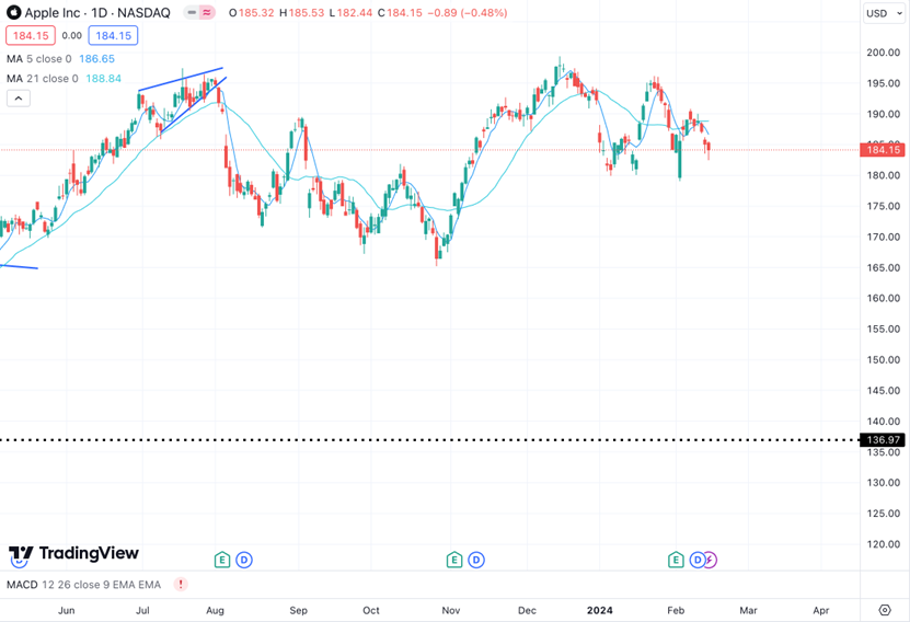 (Source:Apple)说完了优缺点,这里也聊一聊其中的商业价值。开创新市场领域:Apple Vision Pro标志着苹果公司在现实和虚拟现实技术领域的重要进展,这个蛋糕将会非常大。通过推出这款产品,苹果不仅能够吸引技术爱好者和早期采用者,还可提前布局元宇宙。生态系统扩展:苹果以其闭环生态系统而闻名,该生态系统包括硬件、软件和服务。通过将Apple Vision Pro整合到其现有生态系统中,提供更加丰富和沉浸的用户体验,提高客户粘性。新的应用和服务发展:Apple Vision Pro为开发者提供了一个全新的平台,用于创建增强现实和虚拟现实应用。这不仅可以吸引更多的开发者加入苹果生态系统,还能够促进新应用和服务的创新和发展,进一步增强苹果的市场竞争力。提高品牌形象和影响力:通过推出创新的Apple Vision Pro,苹果进一步巩固了其作为科技创新领导者的地位。品牌的形象和影响力继续提高,吸引更多的消费者和企业客户。开拓企业市场:Apple Vision Pro在教育、设计、医疗和制造等行业中的应用潜力巨大。通过这款产品将进一步拓展其在企业市场中的份额,为企业提供定制化的解决方案,从而开辟新的收入来源。随着苹果新产品的单一化,不少人开始诟病苹果的科技创新停滞不前。然而通过这一跨时代产品,苹果将进一步巩固科技创新的地位,部分投资者也会对此买账。苹果股价目前处于一个震荡的阶段。其中存在于进场的机会。