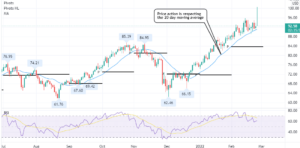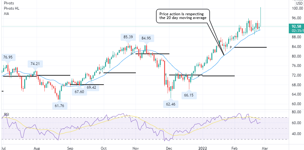 原油的短期波动另一个值得关注的图表是日线范围内的原油。尽管今天早些时候推高至$100以上,但最新的蜡烛图表明市场热衷于压制这些更高水平的走势,并且卖家提供了大量阻力位。因此,尽管长期前景仍然看涨,在 20 天移动平均线(即蓝线)处获得支撑,但我们可能会看到价格暂时盘整至$91.00 。RSI指标也存在轻微的看跌背离,表明短期下行压力。很大程度上取决于乌克兰的进展情况。最后,无论未来几天和几周内发生什么,希望世界领导人都能找到和平解决的方案。但与此同时,请注意市场波动加剧所带来的额外风险——明智地进行交易。作者:Adam Taylor
