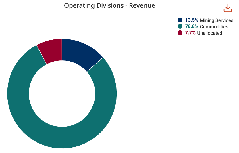 Mineral Resources是一家以铁矿石和锂为主的采矿服务公司,市值高达13.45 billion以提供安全,高质量,低成本的采矿业业务而闻名。此外,公司拥有位于西澳的Mount Marion和Wodgina锂项目的权益。公司净利润率高为34%,同时公司主要的运营业务被分为三大部门:采矿服务部门,大宗商品部门和中央业务部分。这三大业务为公司带来的收入占比如下图所示。