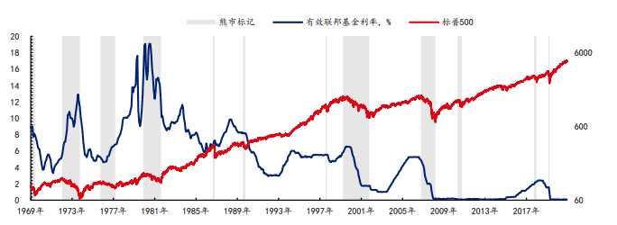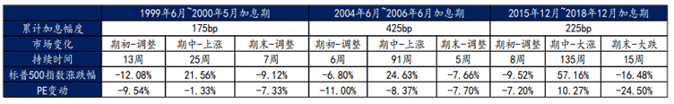加息周期中,美股的表现可以分为两种情况:第一,美股面临盈利上行+货币紧缩的组合。此时美股通常会在加息初期出现 一定幅度的调整,持续时长也通常在几个月以内。随后盈利上行仍将支撑美股继续走高。直到盈利增速出现下行,或投资者对盈利的预期转弱,美股才会真正开启大级别的下跌行情,而这通常发生在加息周期结束之后。第二,美股面临盈利下行+货币紧缩的组合。美国经济处于滞胀状态,典型如20 世纪 70 年代。这段时期,美股通常在货币政策收紧之前就出现调整,因为经济下行压力已经开始显现。当估值达到低位,或滞胀结束时美股就走稳见底。