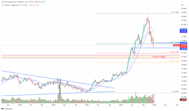 同时汇率的波动又会反向影响其海外资产。大家都知道今年美联储和各国央行开始货币紧缩加息,导致日元贬值严重,其在海外的资产相应也是增加很多。即便是2021年底,日元兑美元汇率为1美元兑115.12日元,与2020年底相比贬值逾1成,其将外币计价资产的估值就推高了81.8万亿日元。当前比如美元也已经开始触顶走低,为了避免后续日元升值带来的利差继续收窄,海外投资会加速回归,市场的机会就来了。首先我们来看下受影响最大之一的货币对美日行情。技术面周线级别如下图,货币对11月初已经下破13和21均线带转为空头趋势,昨日大跌进一步确认下杀。当前价格触及130.5左右支撑压力互换位暂时企稳,短线有机会反弹至133-133.6左右。但空头趋势不改,价格下行将测试下方支撑位在2021年1月至今年最高点的50%斐波那契回调位127和126-124区间,该区间是2015年和2007年高点。如果上述位置无法阻挡日元升值,价格继续下破61.8%位置120左右后,则行情将彻底逆转成空头主导或震荡走势。相反,如果小概率机会出现上涨超过133.6,也不能宣告多头胜利,直至价格能强势突破136-137区间阻力。