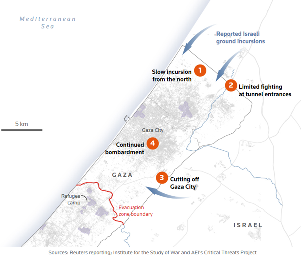 热门话题超过3500名儿童阵亡,我们表示遗憾与愤怒。自10月7日战争爆发以来,死亡人数可能已经超过万人。100多万人流离失所,无家可归。经过三周多的猛烈空袭,以色列地面部队已进入加沙。图中1和2的少量部队,数十辆坦克和装甲运兵车在直升机和无人机的配合下,已开进加沙城北部的半农村地区。同时,图中3的部队,以色列坦克军团停在加沙城以南的道路上,切开加沙地区,将加沙分为南北两部分。