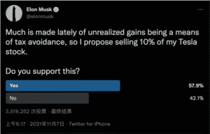 Elon musk上周末在推特上发起了一个投票,内容是说是不是要出售他名下10%的特斯拉股票,用来交税。后来马斯克也再追加了两条声明,分别是说无论投票结果如何,他都会履行承诺,另外就是声明是他现在是没有工资收入的,只有股票。因此他要把他的税交上的话只能把股票给卖了。后来是有大约350多万人投票,最终的结果是有超过半数的人是支持出售特斯拉的股票,之后特斯拉的股价就连续下跌,短短两天市值蒸发两千亿美元。