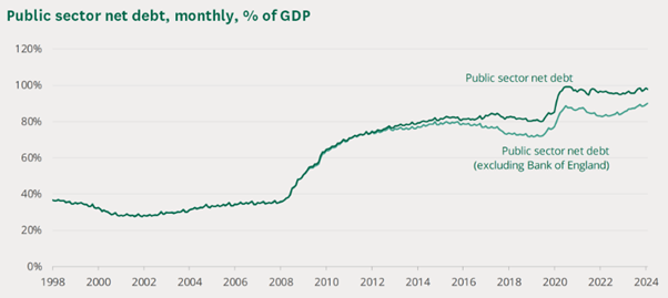 (Source: ONS)从2022年开始,英国经济就一直在地板上挣扎,GDP增长率在G7国家中基本垫底。受新冠疫情影响,2023年第三和第四季度英国GDP甚至一度呈现负增长;英国民众工资增长也非常缓慢,2024年以来,剔除通货膨胀和税赋影响后,增长率仅为可怜的1.5%;英国公共债务也不断攀升已超过GDP。