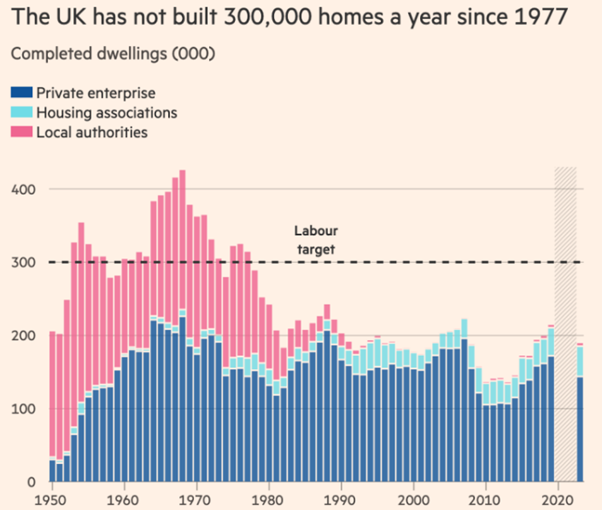 (Source: ONS)本次工党大获全胜,主要是因为保守党不得民心,承诺的事情没有兑现,而苏纳克一把梭哈提前选举,叠加秘书被爆博彩门丑闻,所以工党丝滑上位。工党上台强调的几个计划改革的方向,今天简单与大家掰扯掰扯。房屋建筑方面,工党计划在5年议会期间建造150万套新房,包括挑战在灰带(green belt)和棕地(brownfield)上建房,加速停滞的住房建设。其实保守党政府在2019 年也承诺过每年建造 30 万套新房并施加了强制性建设目标,然而该政策在去年 12 月被废除,承诺也被淡化,现在工党已恢复强制性住房目标。