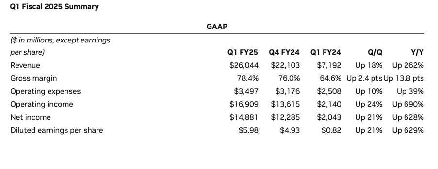 (Source:Nvidia)我们先来整体看一下,在第一季度收入达到260亿美元,较上一季度增长18%,较去年同期增长262%。本季度US.GAAP(美国公认会计原则)每股摊薄收益为5.98美元,较上一季度增长21%,较去年同期增长629%。非GAAP每股摊薄收益为6.12美元,较上一季度增长19%,较去年同期增长461%。