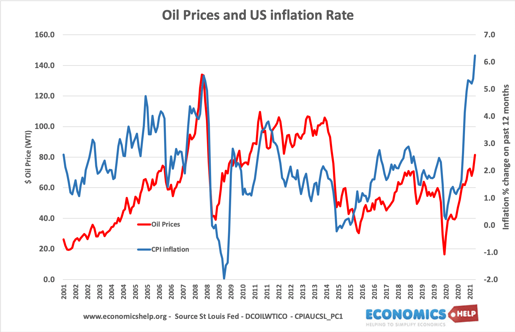 纵观近20年历史,原油价格的上涨总是逃不开与通胀的正相关关系。原油价格大涨之后总是会伴随着通胀的大幅上涨进而引发经济衰退。2000年原油价格达到高点,2001年就迎来了美国的互联网泡沫破裂。2008年原油价格升至147美金之后次贷危机接踵而至,市场对原油的需求减少了导致油价暴跌回40美元。2014年油价大涨过后伴随而来的是欧洲发生主权危机,欧洲产油国联盟破裂。这导致全球的石油产能供应过剩,并且当时以沙特为首的OPEC为保持市场份额完全没有减产的意思,产能过剩进一步加剧,石油价格暴跌。时间来到2020年,新冠病毒流行,全球各国封锁限制出行,对石油的需求又下降了。但是与此同时,病毒肆虐并没有促使俄罗斯和沙特等石油产出大国减少生产的脚步,供给与需求的极度不平衡导致其价格由70美元暴跌至30美元以下。以这近20年的历史来看,经济上升期时生产成本低廉,企业因成本优势实现利润上升,需求逐渐增加逐渐推高原油价格。而当原油价格涨至高位时,通胀也会同时居高不下而引发加息,企业生产成本变高导致需求下降,原油价格又开始暴跌。原油与供需关系以及通胀之间一直是这样循环往复的。
