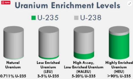 什么是铀浓缩?为了将铀用作反应堆燃料,它在核燃料循环中进行处理。燃料循环过程中一个重要且技术上困难的过程是铀浓缩。核燃料成本的 30% 可归因于浓缩过程。U-235(~0.7%) 和 U-238 (~99.3%) 是铀的两种主要同位素。然而,为了在核反应堆中产生能量,必须分裂(裂变)的是 U-235 原子。富集是指一种同位素相对于其他同位素浓缩的过程。浓缩水平取决于运行的反应堆类型。今天的商业反应堆需要将铀从 0.7% 浓缩到 3-5% 的 U-235。这种燃料称为低浓缩铀(LEU)。对于称为先进核反应堆或小型模块化反应堆 (SMR) 的新一代反应堆,需要高达 20% 的浓缩水平,这种类型的燃料称为高含量 LEU (HALEU)。而用于核武器的铀必须在专门设计用于生产至少 90% U-235 的工厂中进行浓缩。
