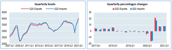 新冠肺炎疫情在全球的流行以及WTO成员采取的卫生措施,使全球商品和服务贸易受到严重影响。全球货物贸易总额、服务贸易等均有大幅下跌。而WTO发布的《世贸组织 2021年年度报告》指出,多边贸易体系在对抗新冠肺炎疫情的努力中发挥了重要作用,贸易的复原力代表了数百万人的生命线,使人们能够获得食物和其他基本用品。报告预测,2021 年世界货物贸易量将增长 8.0%。延续了始于2020年第三季度的复苏势头,以季节性调整后的当前美元计算,G20的国际商品贸易在2021年第一季度创历史新高。与前一季度相比,出口和进口分别增长了8.0%和8.1%。除英国外,所有 G20 经济体在 2021年第一季度均录得正增长,美元贬值和大宗商品价格的相关上涨在从 COVID-19 低点复苏中发挥了作用。