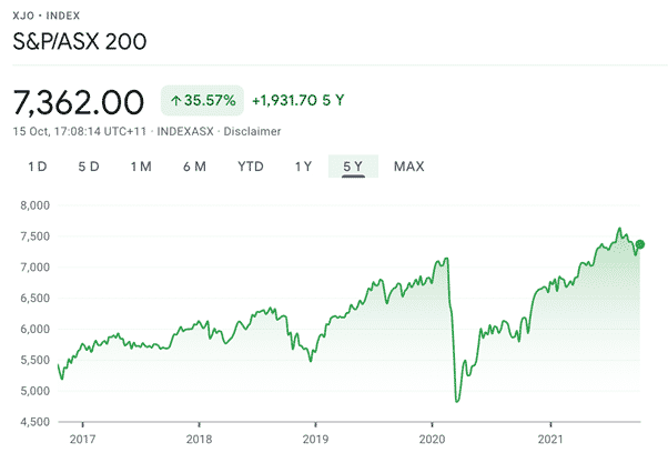 从近一年的数据可以看出,澳大利亚股在2020年11月到2021年9月稳步上涨。但从过去五年的整体数据看来,在ASX 200 指数于 2020 年 1 月 16 日首次突破 7,000 点水平后,在2020年3月跌至了最低4816.60,而后又呈现稳步上涨的趋势。