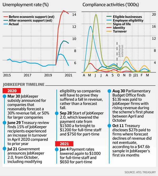 在疫情期间施行的JobKeeper政策帮助支撑了国民经济,国民经济在 2020 年 3 月持续创下有记录以来最大的月度商业信心跌幅,并将失业率峰值“至少”降低了 5 个百分点。JobKeeper 不仅影响收到付款的个别公司的生存能力,而且影响更广泛的经济复苏,这反过来又会进一步影响JobKeeper领取者。据财政部称,如果没有政府的刺激措施,澳大利亚的总劳动生产率将下降 5%(JobKeeper在今年秋季避免了一半的下降)。该计划还帮助企业获得信心,将其在经济低迷时期累积起来的 480 亿美元现金再投资。财政部还声称,JobKeeper 偏向于可能因收入减少而瘫痪的生产力更高的企业,从而推动了经济复苏。
