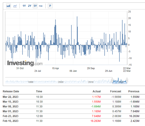 对原油形成短期明显扰动的最大原因还是市场的恐慌情绪,投资者近期对银行业的信心危机也引发对全球经济衰退的担忧,此时油价金融属性凸显。资金面转向黄金等避险类产品同时避开石油类大宗商品。尽管美国救市,瑞信被收购的新闻平缓风波,但是投资者信心脆弱。比如美国贴现窗口借款暴增,美国银行业向美联储借钱的规模直接超越2008年金融危机,说明美国银行系统可能存在不可预计的暗流涌动。资金方面油价打破70美元阻力位后引发连锁反应,像EA交易、算法交易等都会倾向于抛售原油,放大价格波动,所以上周五油价直接跌落65美元附近。这都是由于短期内资金和情绪的影响下使得原油价格承压。回归到供需关系来分析石油的商品属性以把握长期走势。本周三夜盘EIA美国能源信息署公布的美国公司商业原油库存变化数据显示,截至3月17日当周 EIA原油库存变动 111.7万桶,预期值-156.5万桶,前值155万桶。实质上仔细观察数据会发现,1月以来原油库存基本平均始终高于预测值。原油库存的增加通常暗示供应充足,对于油价是利空因素。